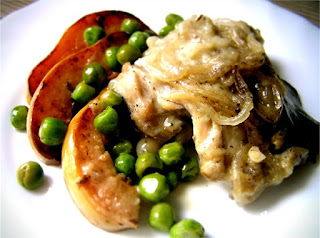 В той же сковороде обжарить нарезанную дольками айву, выложить в миску. Затем слегка обжарить лук, вернуть в сковороду кусочки курицы и айву, перемешать, влить вино, дать вывариться. Влить немного бульона, тушить около 20 минут, добавив любимые специи и лавровый лист. Затем всыпать зеленый горошек, тушить еще 5-7 минут до готовности. Вам наверняка понравится сочетание горошка и айвы с нежной курочкой!